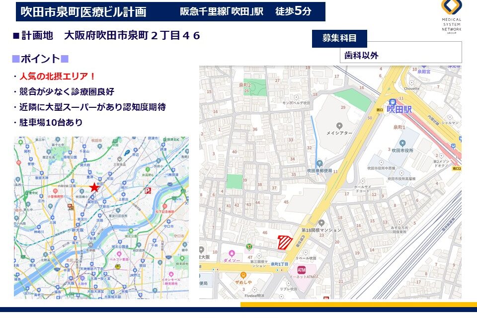 | その他 : | ・人気の北摂エリア! ・競合が少なく診療圏良好 ・近隣に大型スーパーがあり認知度期待 ・駐車場10台あり |