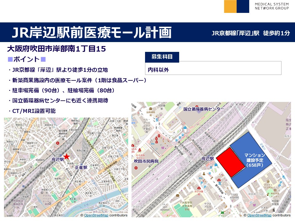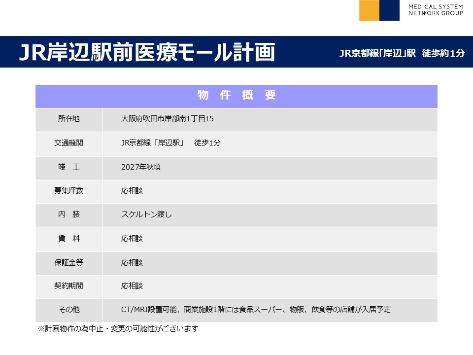 | その他 : | ・JR京都線「岸辺」駅より徒歩1分の立地 ・新築商業施設内の医療モール案件(1階は食品スーパー) ・駐車場完備(90台)、駐輪場完備(80台) ・国立循環器病センターにも近く連携期待 ・CT/MRI設置可能 |