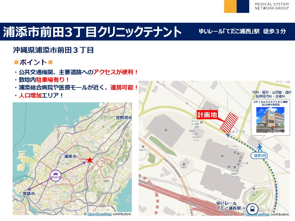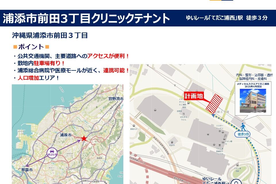 その他 : | ・公共交通機関、主要道路へのアクセスが便利! ・敷地内駐車場有り! ・浦添総合病院や医療モールが近く、連携可能! ・人口増加エリア! |