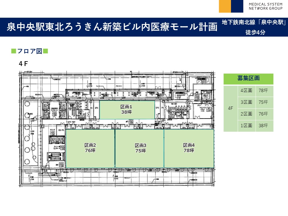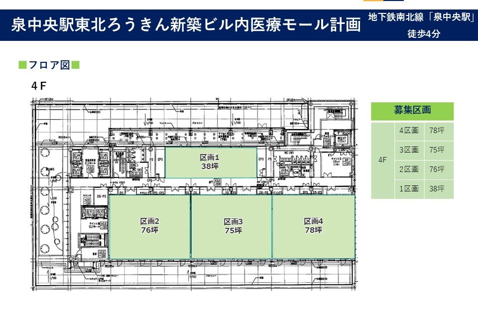 面積(坪) : 4階 区画1:38坪、区画2:76坪、区画3:75坪、区画4:78坪