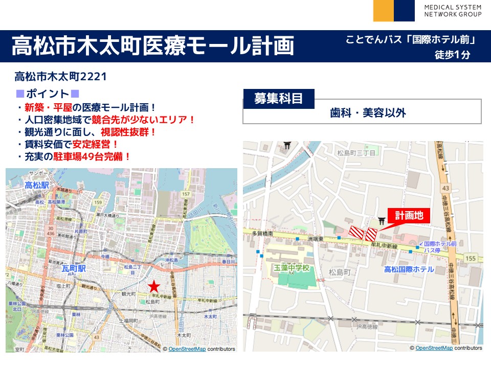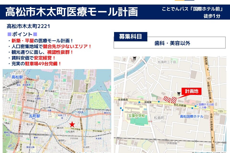 | その他 : | ・新築・平屋の医療モール計画! ・人口密集地域で競合先が少ないエリア! ・観光通りに面し、視認性抜群! ・賃料安価で安定経営! ・充実の駐車場49台完備! |