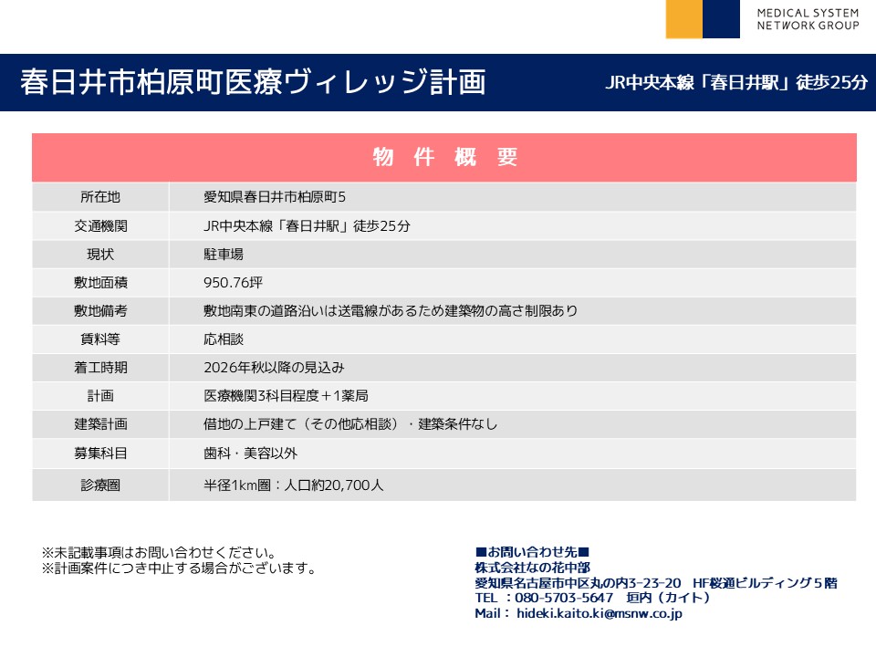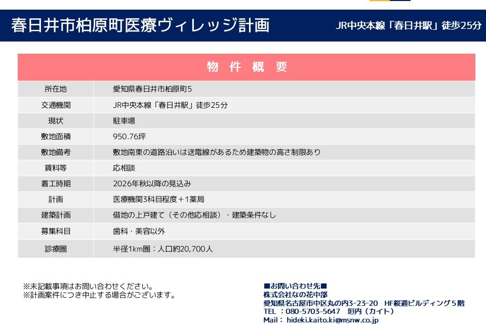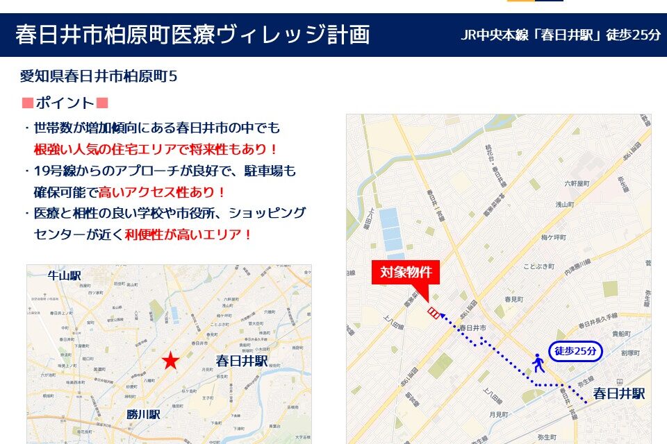 | その他 : | ・世帯数が増加傾向にある春日井市の中でも根強い人気の住宅エリアで将来性もあり! ・19号線からのアプローチが良好で、駐車場も確保可能で高いアクセス性あり! ・医療と相性の良い学校や市役所、ショッピングセンターが近く利便性が高いエリア! |
