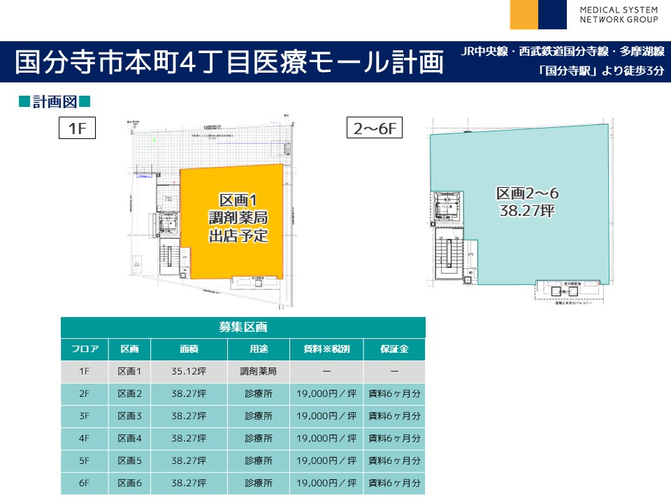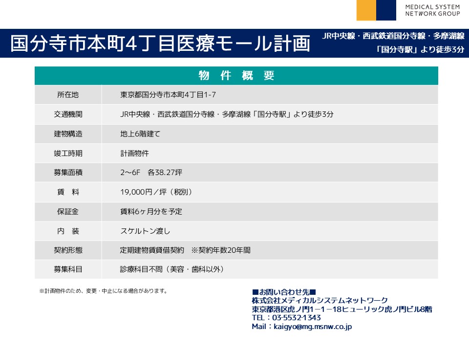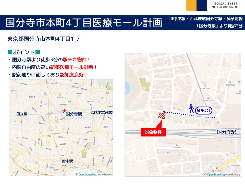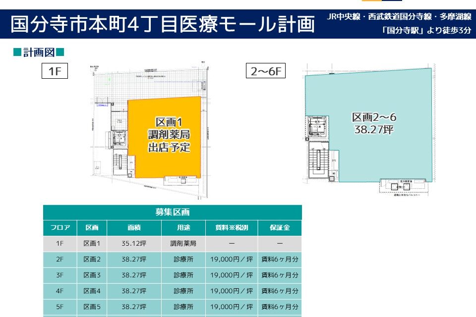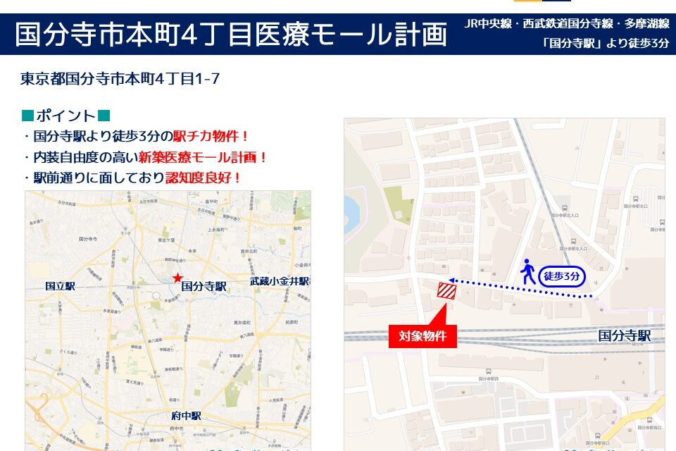 | その他 : | ・国分寺駅より徒歩3分の駅チカ物件! ・内装自由度の高い新築医療モール計画! ・駅前通りに面しており認知度良好! |