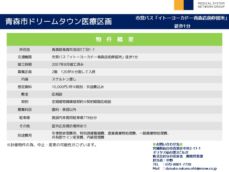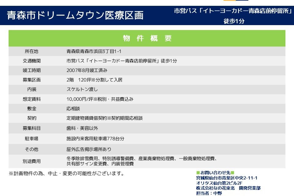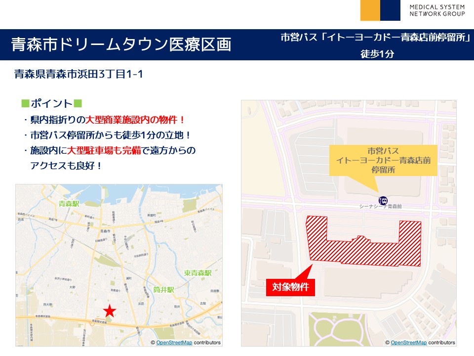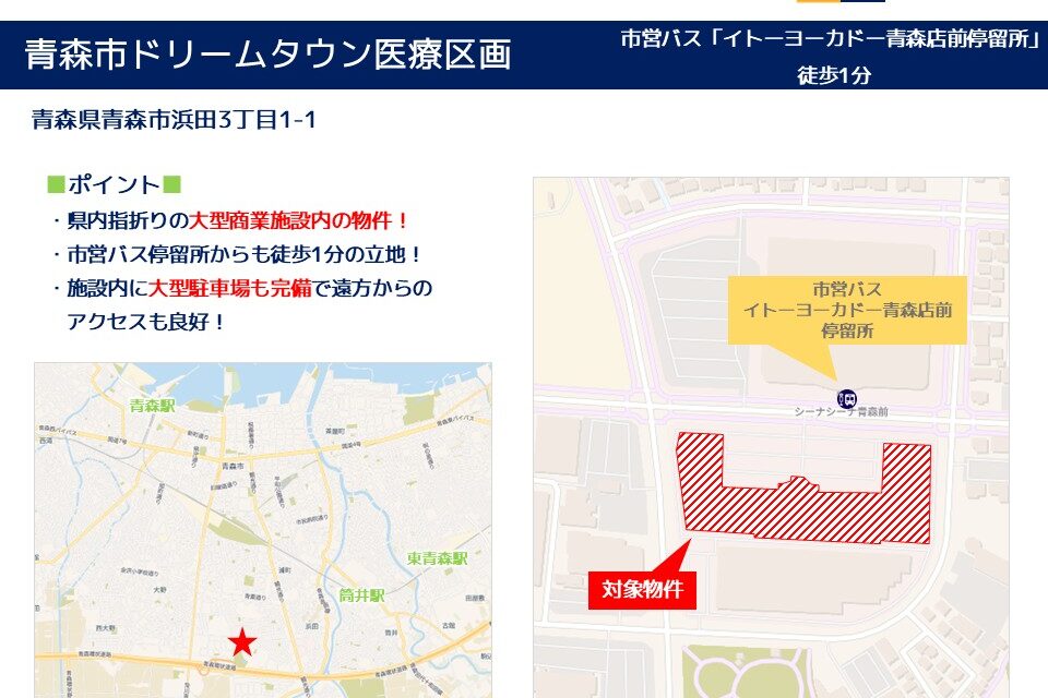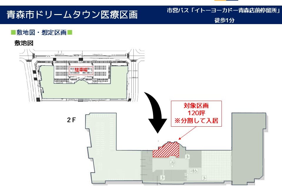 青森市ドリームタウン医療区画 住 所: 青森県青森市浜田3丁目1-1 募集科目: 内科 皮膚科 婦人科 小児科 耳鼻科 眼科 整形外科 形成外科 脳神経外科 乳腺外科 精神科 心療内科 面積(坪) : 2階 120坪※分割して入居 時 期: 2007年8月竣工済み その他 : ・県内指折りの大型商業施設内の物件! ・市営バス停留所からも徒歩1分の立地! ・施設内に大型駐車場も完備で遠方からのアクセスも良好!