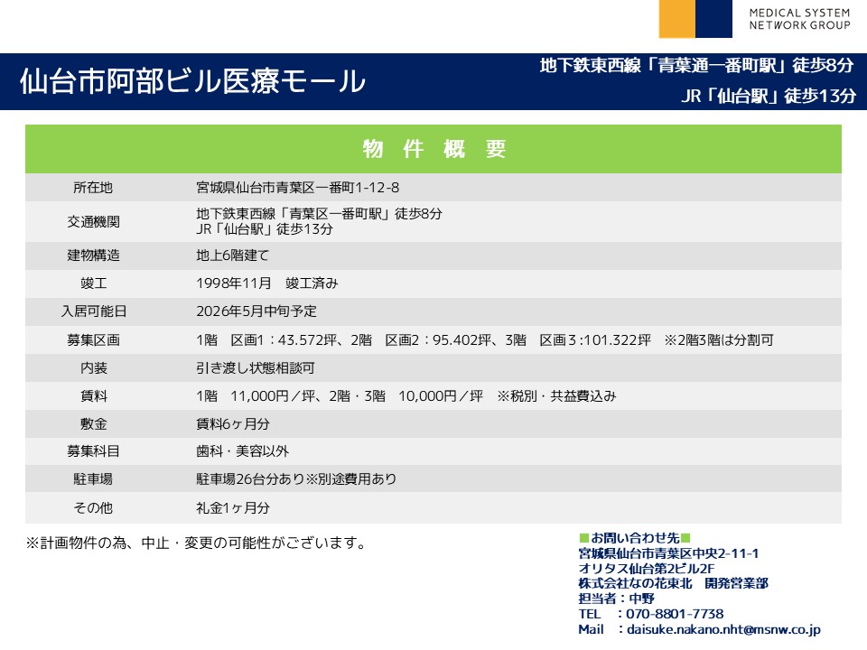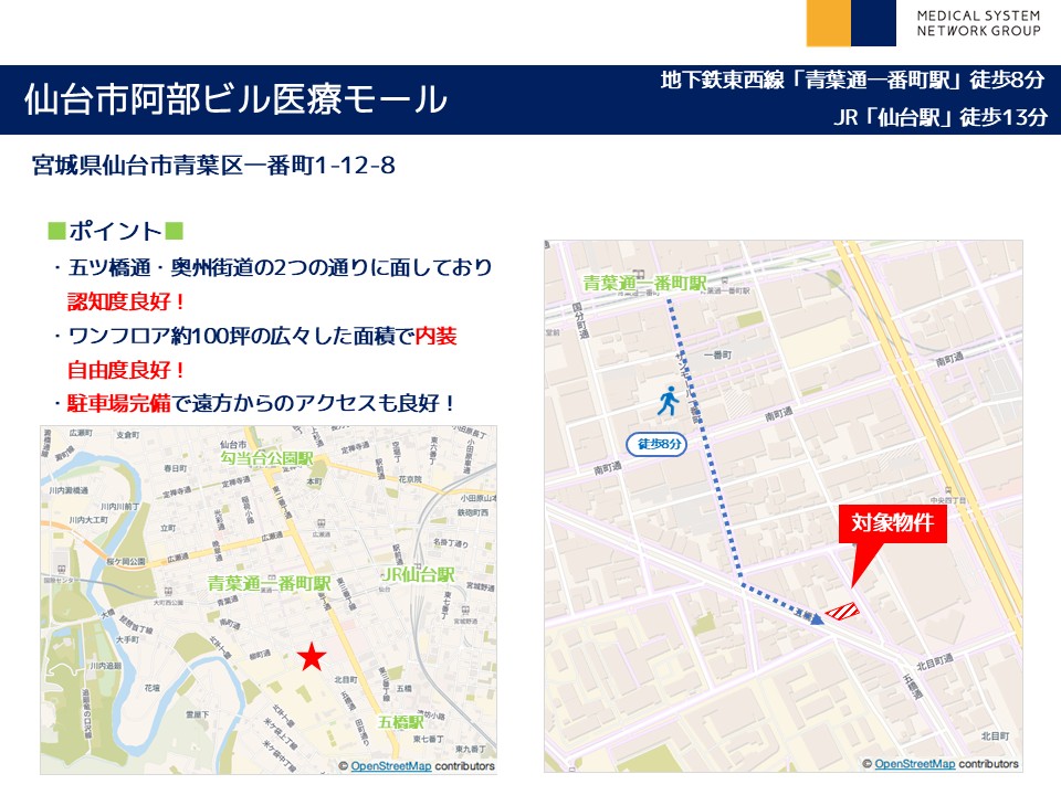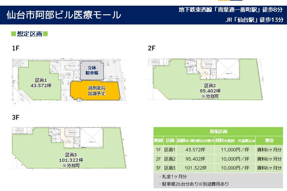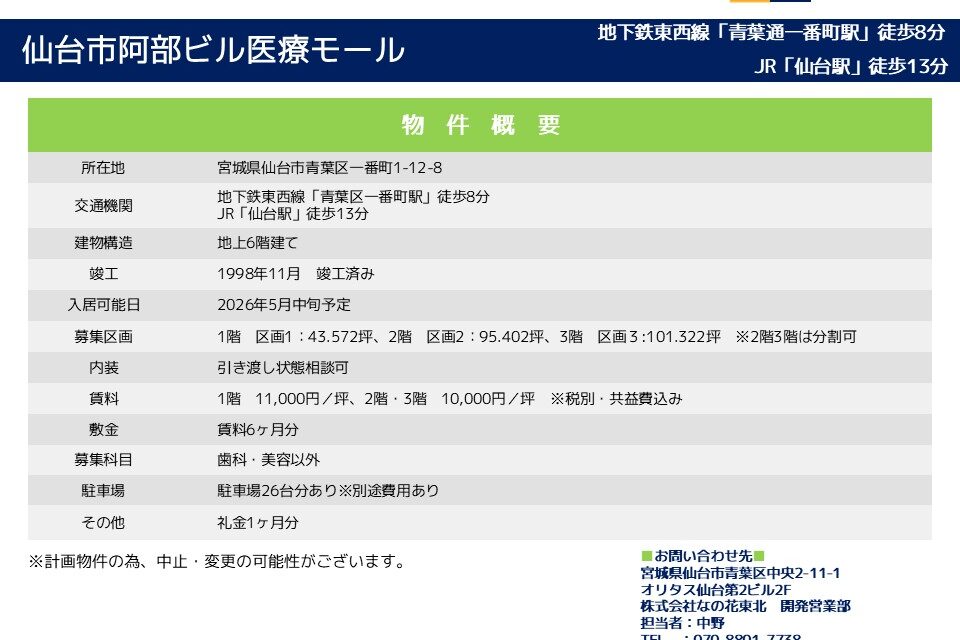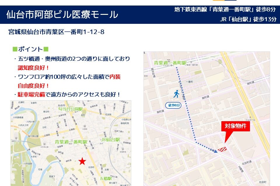 | その他 : | ・五ツ橋通・奥州街道の2つの通りに面しており認知度良好! ・ワンフロア約100坪の広々した面積で内装自由度良好! ・駐車場完備で遠方からのアクセスも良好! |