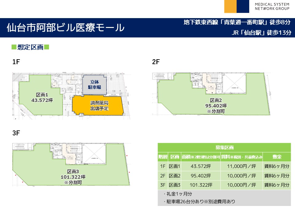 | 面積(坪) : | 1階 区画1:43.572坪、2階 区画2:95.402坪、3階 区画3:101.322坪 ※2階3階は分割可 |