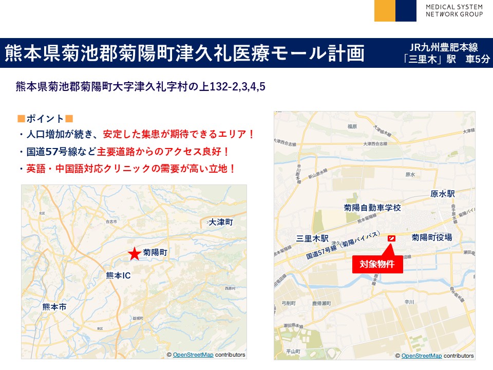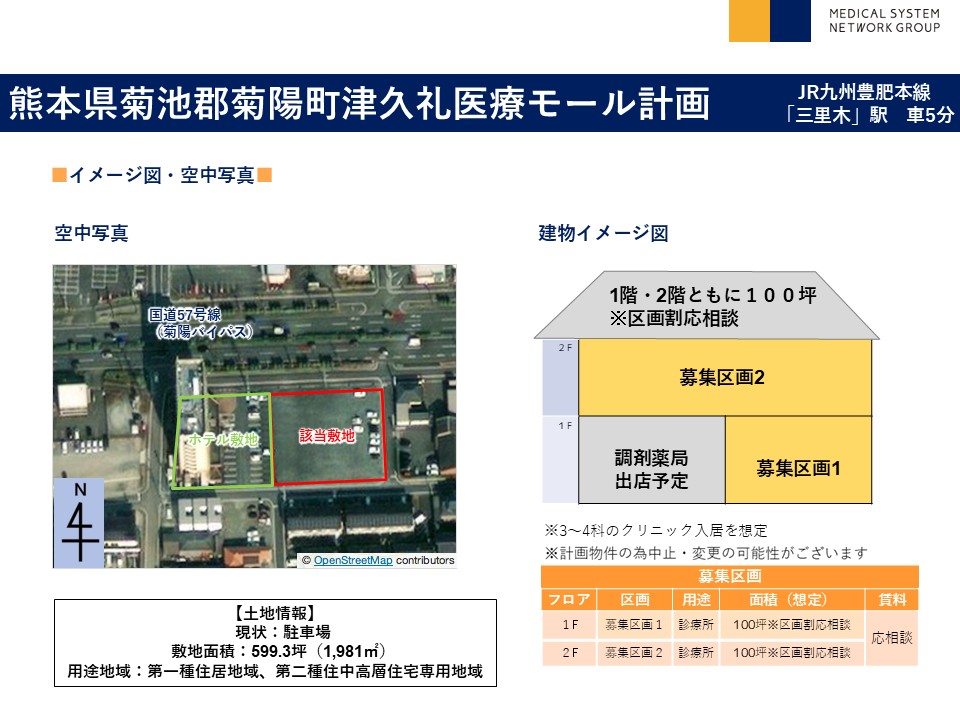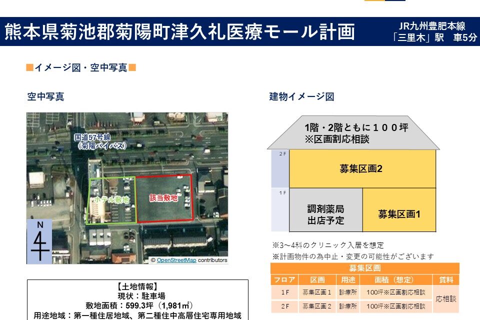 | その他 : | ・人口増加が続き、安定した集患が期待できるエリア! ・国道57号線など主要道路からのアクセス良好! ・英語・中国語対応クリニックの需要が高い立地! |
