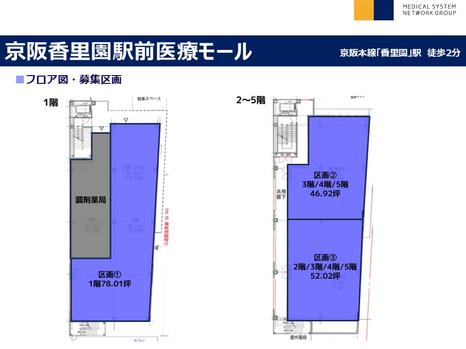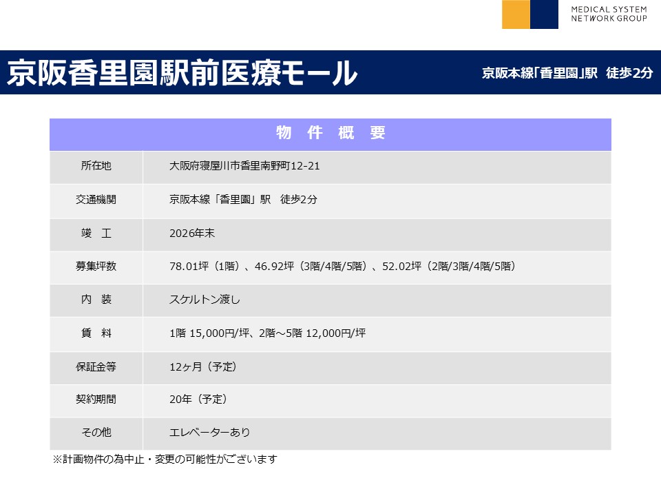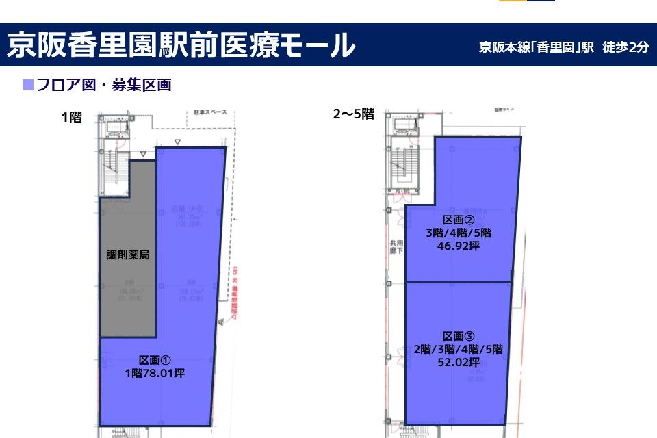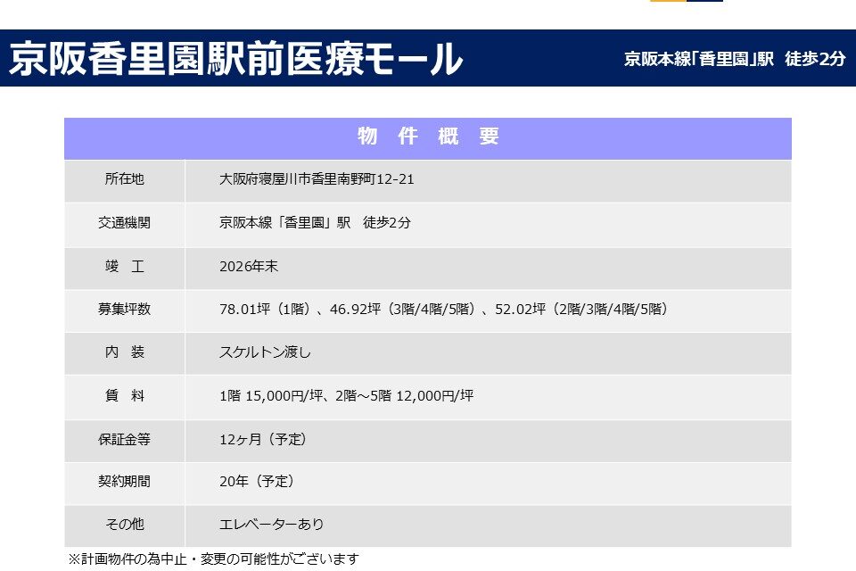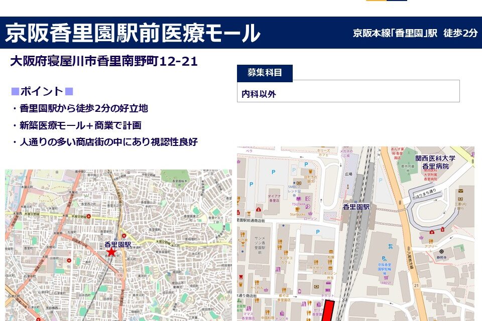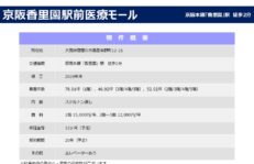 | その他 : | ・香里園駅から徒歩2分の好立地 ・新築医療モール+商業で計画 ・人通りの多い商店街の中にあり視認性良好 |