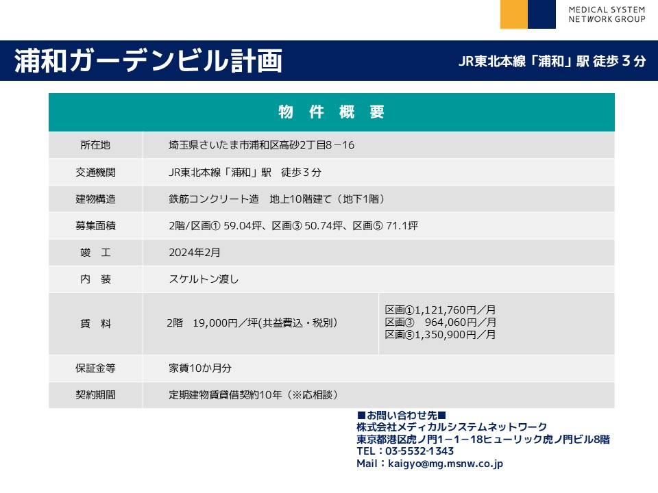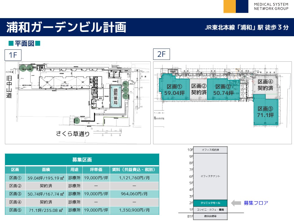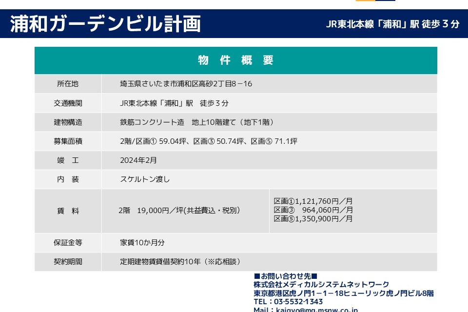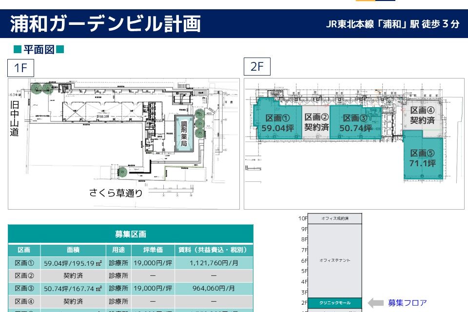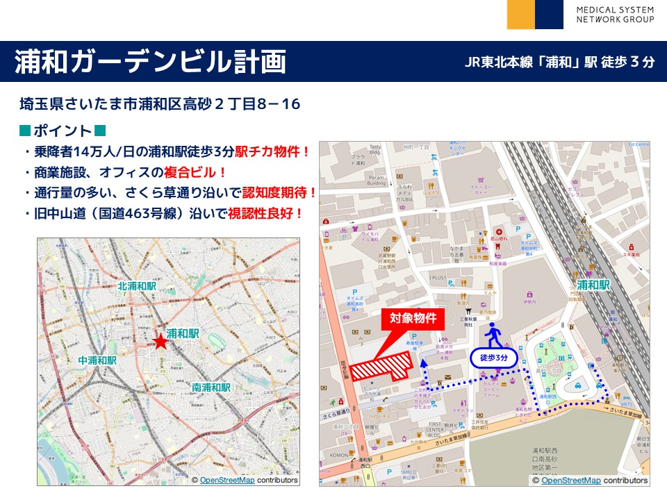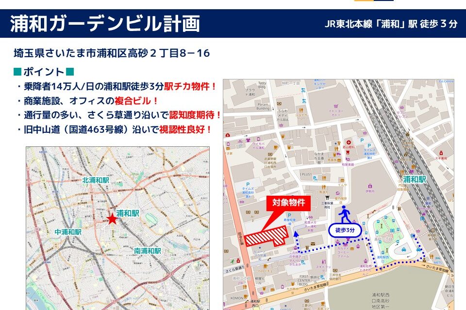 | その他 : | ・乗降者14万人/日の「浦和駅」徒歩3分駅チカ物件! ・商業施設、オフィスの複合ビル! ・通行量の多い、さくら草通り沿いで認知度期待! ・旧中山道(国道463号線)沿いで視認性良好! |