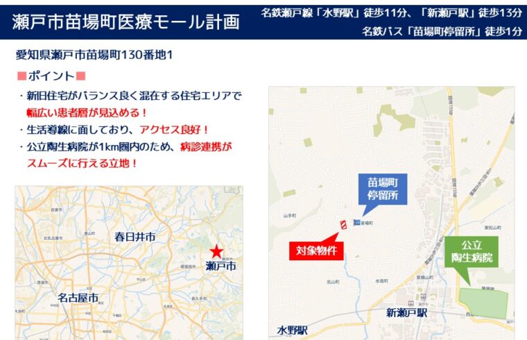 当社では、メディカルモールやメディカルビルなど複数の医療機関を同一敷地内にまとめることで、患者さまが専門医の診察を一箇所で複数受診できるという利便の良い形態の企画開発を行っています。開業する先生方にとっては、施設の共用によるコスト削減や、広報、集患面の相乗効果による効率的な経営が可能になります。